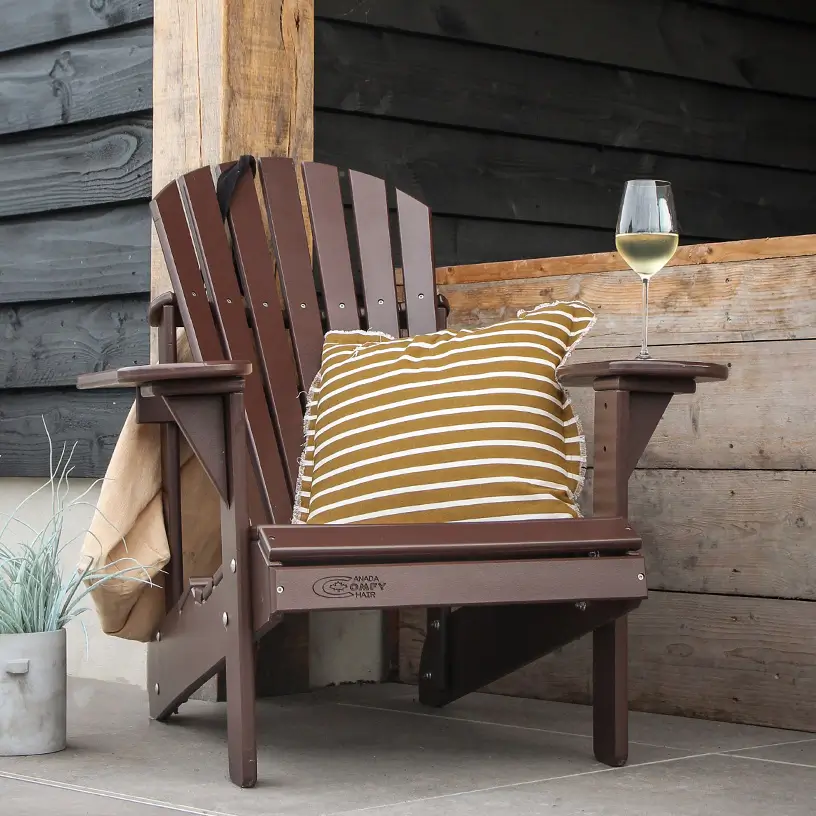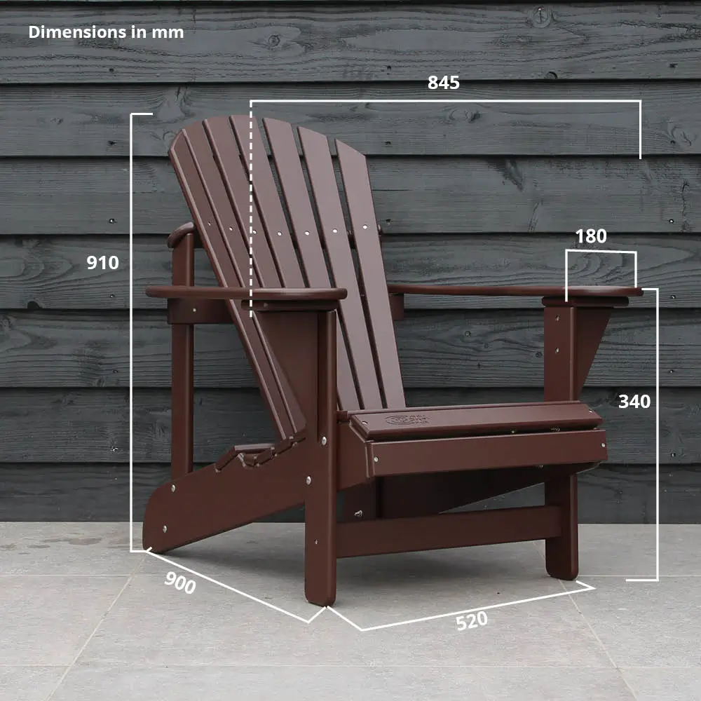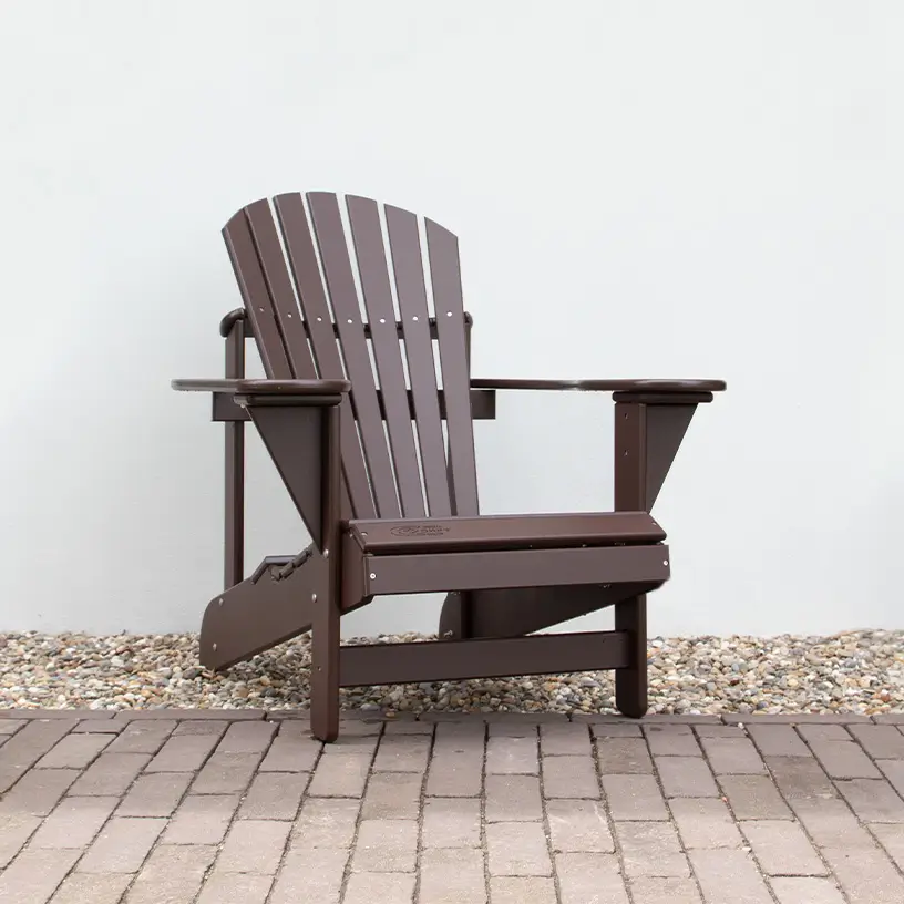 De donkerbruine Comfy Chair Original heeft een warme, natuurlijke kleur. Deze adirondack zit net zo lekker als de klassieke houten variant, maar is gemaakt van praktisch kunststof.